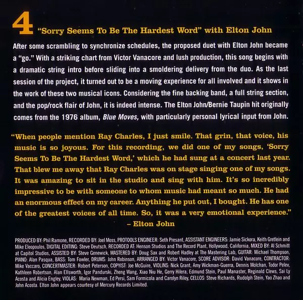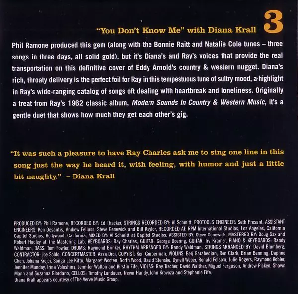 | Bass Tom Fowler | Cello John Krovoza, Stefanie Fife, Tim Landauer, Trevor Handy | Copyist Ken Gruberman | Drums Ray Brinker | Guitar George Doering, Irvin Kramer | Keyboards Ray Charles | Piano, Keyboards Randy Waldman | Viola Andrew Picken, David Walther, Miguel Atwood-Ferguson, Ray Tischer, Shawn Mann, Suzanna Giordano | Violin Berj Garabedian, Brian Benning, Daphne Chen, David Stenske, Dynell Weber, Irina Voloshina, Jennifer Munday (2), Jennifer Walton, Johana Krejci, Julie Rogers (2), Kirsten Fife, Margaret Wooten, North Wood, Raymond Kobler, Ron Clark, Ronald Folsom, Songa Lee-Kitto | Vocals [Duet] Diana Krall | |||