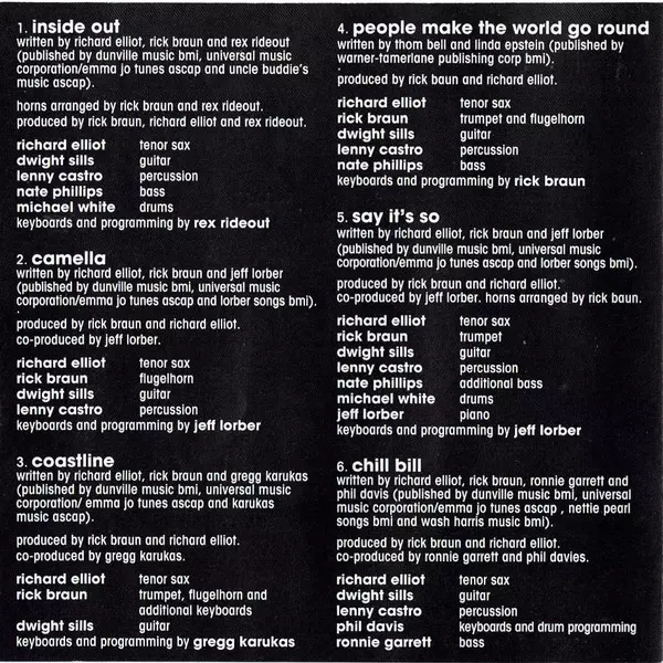 Arranged By [Horns] Rick Braun | Bass Nathaniel Phillips | Drums Michael White (5) | Guitar Dwight Sills | Keyboards, Programmed By, Arranged By [Horns] Rex Rideout | Percussion Lenny Castro | Written-By Richard Elliot, Rick Braun