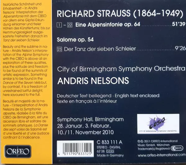 | Artiste | Richard Strauss | Andris Nelsons | City Of Birmingham Symphony Orchestra |