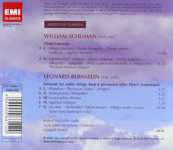 | Artiste | Leonard Bernstein | Saint Louis Symphony Orchestra | Leonard Slatkin | William Schuman | Robert McDuffie |