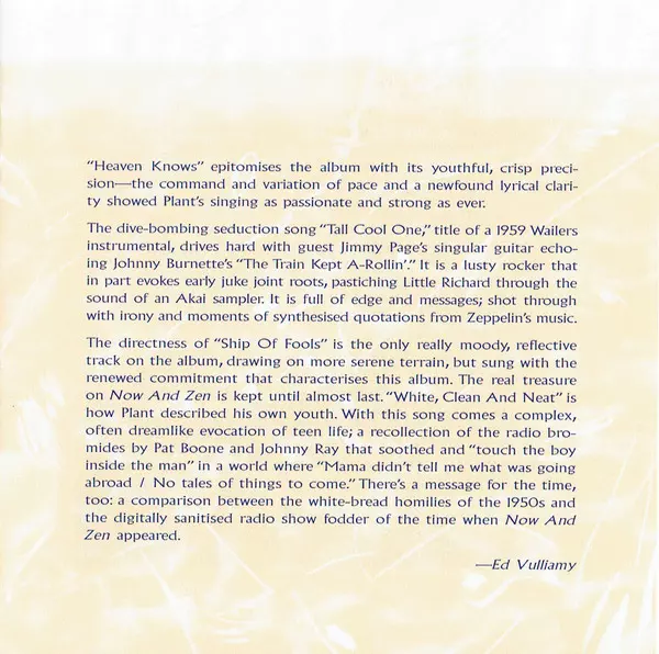 Now and Zen is the sixth studio album by English rock singer Robert Plant , released on 10 October 1988. The album was produced by Tim Palmer, who also produced Plant's previous album The Principle of Moments. Palmer and Plant assembled a group of session musicians to record the album, including Chris Blackwell, Robbie Blunt, Phil Collins and Ji...