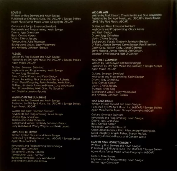Backing Vocals [Background Vocals] Kim Johnson, Lucy Woodward | Bass Conrad Korsch | Drums Iggy Grimshaw | Guitar Emerson Swinford | Keyboards, Programmed By [Programming] Kevin Savigar | Trumpet Anne King (2) | Violin J'Anna Jacoby | Written-By Kevin Savigar, Rod Stewart