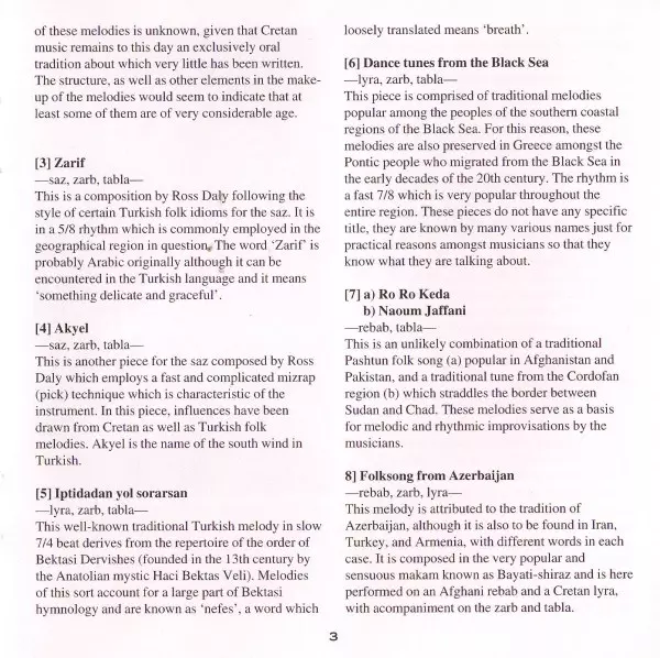 | Artiste | Ross Daly | Djamchid Chemirani | Irshad Hussain Khan |