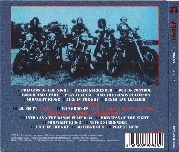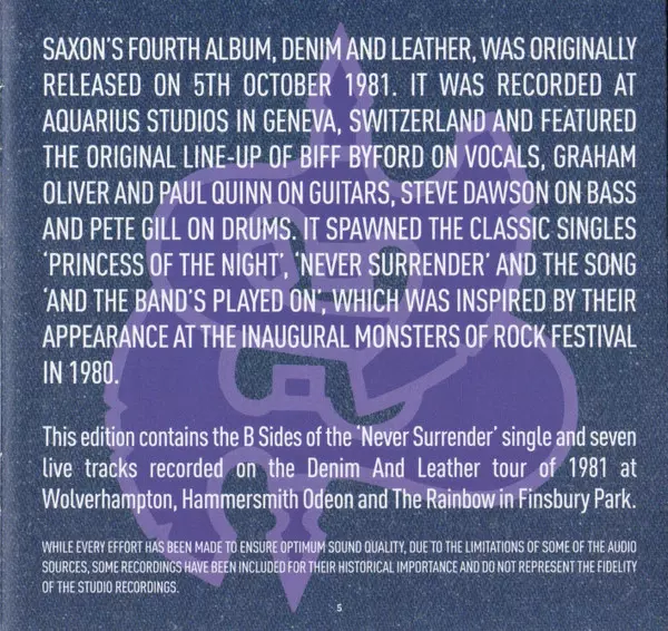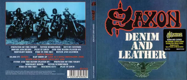 Reedice čtvrtého alba legendy NWOBHM Saxon. "Denim And Leather" je čtvrté studiové album legendární heavymetalové skupiny Saxon, původně vydané v říjnu 1981. Se singly "Princess Of The Night", "Never Surrender" a nahrané v Aquarius Studios v Ženevě, bylo album dosud nejúspěšnějším albem skupiny.