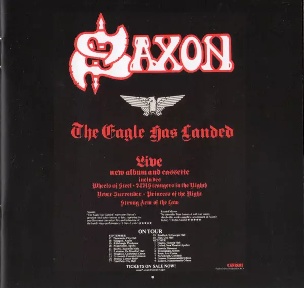 Reedice legendárního živého alba Saxon z roku 1982. "The Eagle Has Landed" bylo první živé album Saxon a vyšlo v roce 1982. Bylo nahráno během turné "Denim And Leather" v roce 1981 a smícháno ve studiu Manor And Bray Sound. Mělo obrovský úspěch a dostalo se do Top 5 britské albové hitparády.