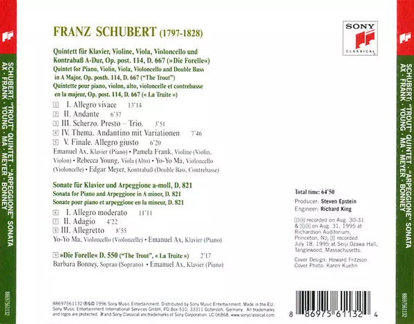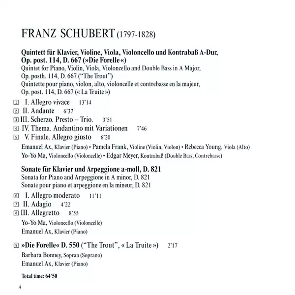 | Artiste | Franz Schubert | Yo-Yo Ma | Barbara Bonney | Emanuel Ax | Pamela Frank | Edgar Meyer | Rebecca Young |