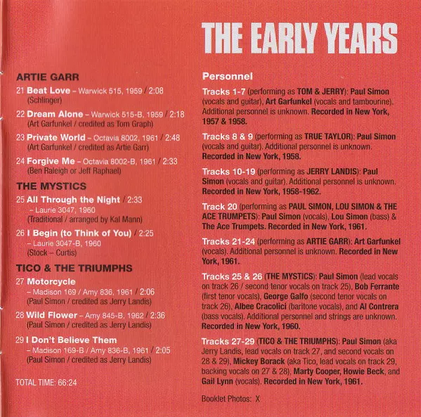 This essential collector's edition features 29 remastered studio tracks from Paul Simon and Art Garfunkel's early years, consisting of various songs from between 1957 and 1962 + an extensive 16-page booklet.
