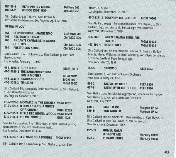 | 4-20 | Slim Gaillard And His Musical Aggregations, Wherever He May Be: You Goofed | 2:45 min | |