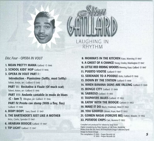 | Bass, Vocals Tiny "Bam" Brown | Drums Zutty Singleton | Guitar, Keyboards [Novachord], Vocals Slim Gaillard | Piano Dodo Marmarosa | Written-By Slim Gaillard | |||