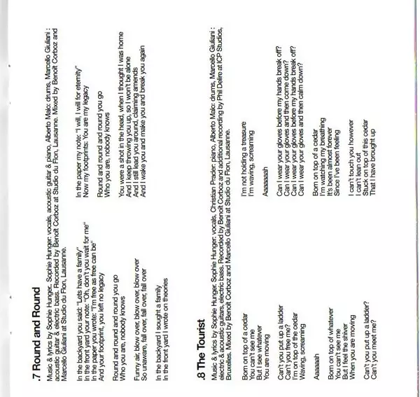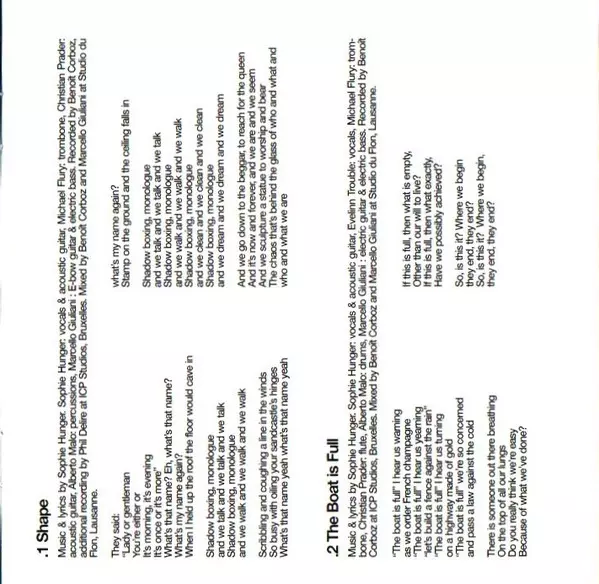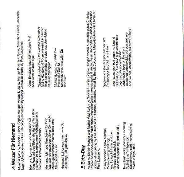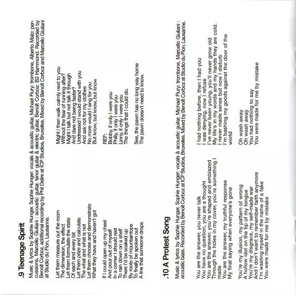 Acoustic Guitar Christian Prader | Guitar [E-bow-], Electric Bass, Mixed By Marcello Giuliani | Percussion Alberto Malo | Recorded By [Additional] Phil Delire | Recorded By, Mixed By Benoît Corboz | Trombone Michael Flury | Written-By, Vocals, Acoustic Guitar Sophie Hunger