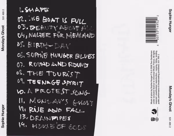 Sophie Hunger: Monday's Ghost La version sur CD en Norme édition. Cette édition particulière a été publiée en L'Europe dans la maison d'édition Universal Music Jazz France En collaboration avec Two Gentlemen Le 27 février 2009. Album couvre tous les genres Rock, Folk, World, & Country et Folk Rock.