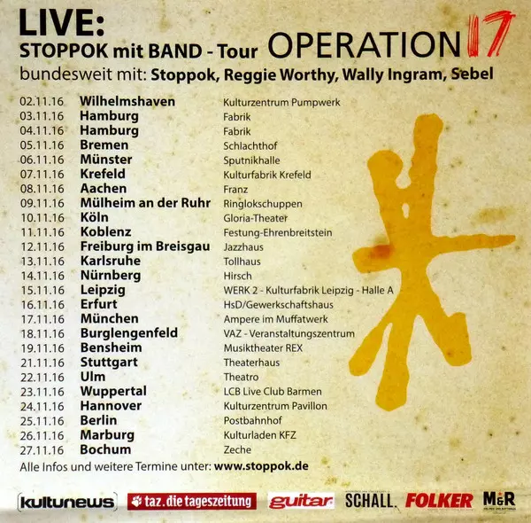 Stoppok: Operation 17 La version sur Le vinyle 2LP/CD en Norme édition. Cette édition particulière a été publiée en Allemagne dans la maison d'édition Grundsound Le 30 septembre 2016. Album couvre tous les genres Rock, Pop, Musique acoustique, Pop Rock et Blues-Rock.