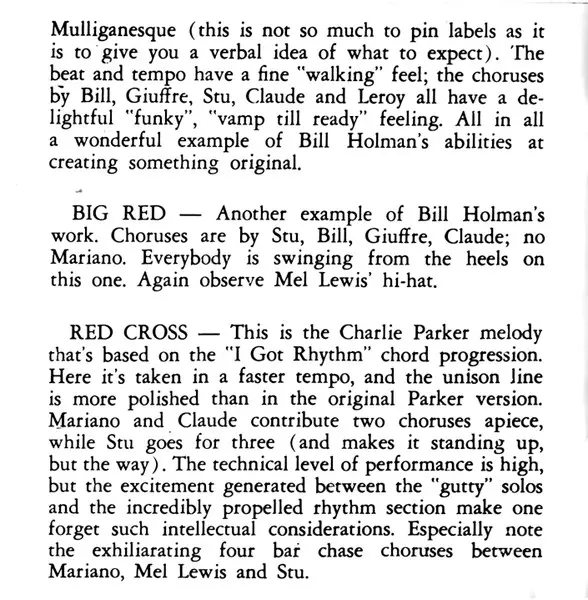 | Artiste | Charlie Mariano | Jimmy Giuffre | Bill Holman | Claude Williamson | Stu Williamson |