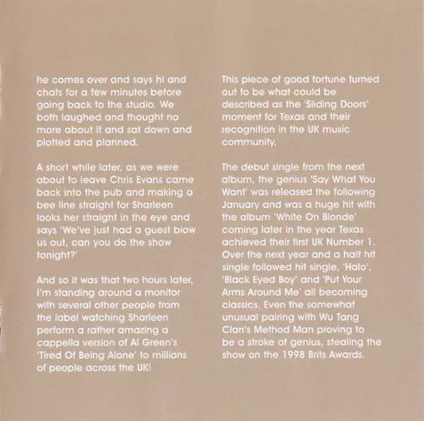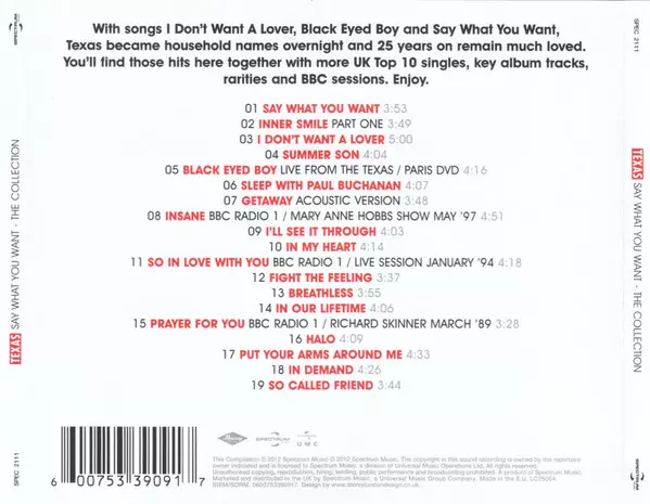 Texas: Say What You Want - The Collection La version sur CD en Norme édition. Cette édition particulière a été publiée en ROYAUME-UNI dans la maison d'édition Spectrum Music (2) Le 16 janvier 2026. Album couvre tous les genres Rock, Pop et Pop Rock.