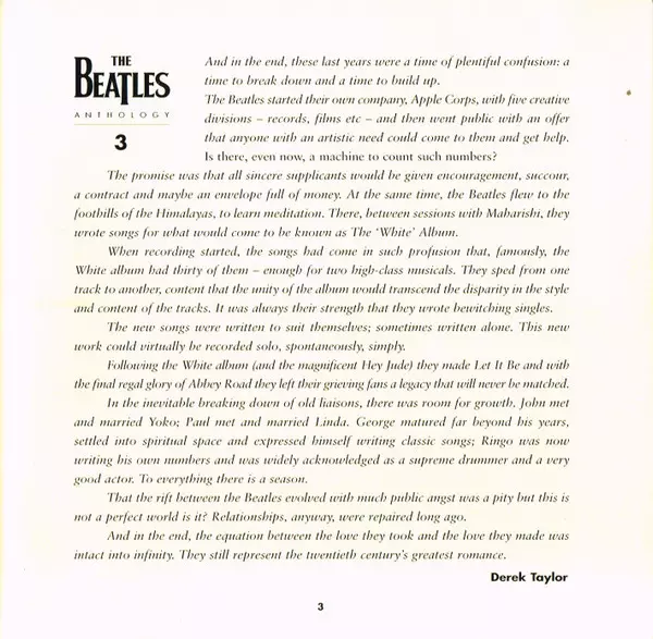 Historie BEATLES je historií moderní pop music - a tato historie je teprve nyní kompletní. Po celosvětovém triumfu "ANTHOLOGY I a II" s více než 13 miliony prodaných desek po celém světě (zadního katalogu Beatles se tehdy prodalo více než 6 milionů kusů po celém světě) a vydání nejvýznamnějšího hudebního dokumentu na videu ("ANTHOLOGY" 1-8) je n...
