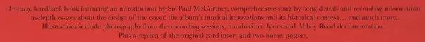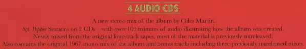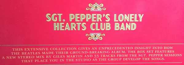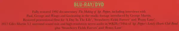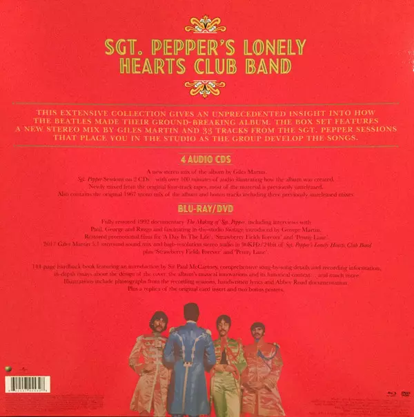 THE BEATLES CELEBRATE 'SGT. PEPPER'S LONELY HEARTS CLUB BAND' WITH SPECIAL ANNIVERSARY EDITIONS. RELEASED MAY 26, 2017. 'Sgt. Pepper' will feature new mixes in stereo and 5.1 Surround Audio; expanded with previously unreleased session recordings, video footage and special packaging. Previously unreleased 1992 documentary 'The Making of Sgt. Pepper,' restored for the anniversary edition Super Deluxe Boxed Set. It was fifty years ago on June 1, when The Beatles - John Lennon, Paul McCartney, George Harrison and Ringo Starr stunned and delighted the Summer of Love world with the release of Sgt. Pepper's groundbreaking masterpiece, Sgt. Pepper's Lonely Hearts Club Band, which has become one of the most critically acclaimed albums in popular music. To celebrate the moment, The Beatles will release a series of exclusively presented anniversary editions of 'Sgt. Pepper' on May 26 (Apple Corps Ltd./Capitol/USM). The album is newly mixed by Giles Martin and Sam Okell in stereo and 5.1 surround audio, and augmented with early studio session recordings - 34 previously unreleased tracks in total."It's crazy to think that fifty years later we look back on this project with so much love and also with wonder at how four guys, one great producer and his engineers actually managed to create such an ageless work of art," says Paul McCartney in his new introduction to the anniversary edition of 'Sgt. Pepper'."'Sgt. Pepper' seems to have captured the feel of that year, and also allowed many other people in that moment to really kick the propeller and dive in," Ringo Starr recalls in the anniversary edition book.This is the first time Sgt. Pepper's Lonely Hearts Club Band album has been remixed and presented with other session recordings, and it's also the first Beatles album to be remixed and expanded since Let It Be... Naked in 2003. To create the new stereo and 5.1 surround audio mixes for 'Sgt. Pepper ' producer Giles Martin and mix engineer Sam Okell worked with an expert team of engineers and audio restoration specialists at Abbey Road Studios in London. All Anniversary Editions include Martin's new stereo mix of the album, which was taken directly from the original four-track tapes from the sessions, taking into account the original Beatles' preferred mono mix, which was created by his father George Martin.The Sgt. Pepper's Lonely Hearts Club Band Anniversary Edition includes:Super Deluxe: Complete six-disc boxed set includes:CD 1: New stereo album mixCDs 2 & 3:- 33 additional, mostly unreleased recordings from the studio sessions- New stereo mix of "Penny Lane" and 2015 stereo mix of "Strawberry Fields Forever "CD 4:- Mono mix of the singles "Strawberry Fields Forever" and "Penny Lane"- Capitol Records' U.S. promotional mono single mix of "Penny Lane"- Unreleased mono mixes of "She's Leaving Home," "A Day In The Life," and "Lucy In The Sky With Diamonds "Discs 5 & 6 (Blu-ray and DVD):- New 5.1 surround audio mixes of the album and "Penny Lane" by Giles Martin and Sam Okell, plus their 2015 5.1 surround mix of "Strawberry Fields Forever"- High resolution audio versions of the new stereo mixes of the album and "Penny Lane" and the 2015 stereo mix of "Strawberry Fields Forever"- Video: 4K restored promo films for "Strawberry Fields Forever," "Penny Lane," and "A Day In The Life;" plus The Making of Sgt. Pepper, a restored documentary with commentary and interviews with McCartney, Harrison, and Starr, and studio footage presented by George Martin.This edition includes a 144-page bound book with many contributions, lyrics, and photos.