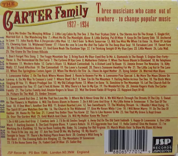 The Carter Family: 1927-1934 La version sur 5CD/Coffret en Remasterisé édition. Cette édition particulière a été publiée en ROYAUME-UNI dans la maison d'édition JSP Records Le 22 juillet 2004. Album couvre tous les genres Folk, World, & Country et Country.