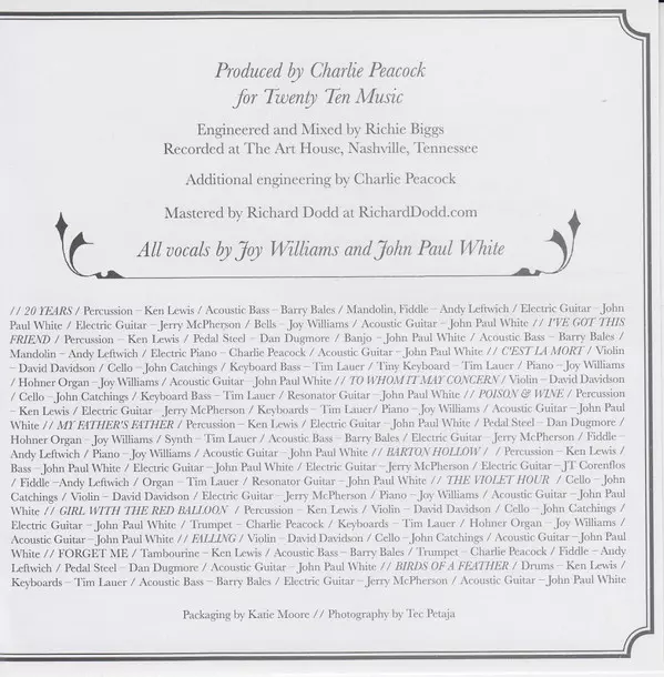 Acoustic Guitar John Paul White | Bass [Keyboard], Keyboards [Tiny] Tim Lauer | Cello John Catchings | Piano, Electric Organ [Hohner Organ] Joy Williams (2) | Violin David Davidson