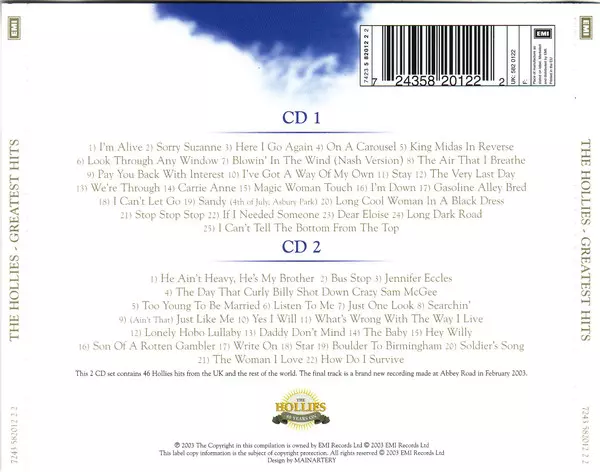 Toto dvojCD obsahuje 47 nejznámějších písní skupiny Hollies v remasterované verzi. Skupina THE HOLLIES byla od samého počátku proslulá svým tříhlasým harmonickým zpěvem a byla brzy považována za průkopníky popové hudby. Ve složení Allan Clarke, Bobby Elliot, Tony Hicks, Graham Nash a Eric Haydock nahráli v roce 1964 své debutové album pro vydava...