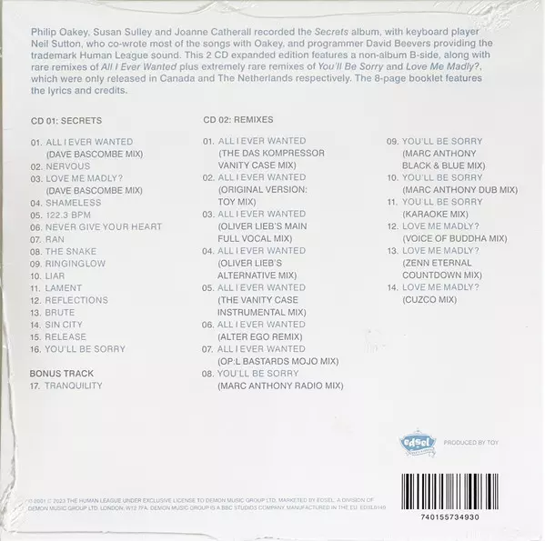 The Human League: Secrets DLX La version sur 2CD en deluxe édition. Cette édition particulière a été publiée en L'Europe dans la maison d'édition Edsel Records Le 1 septembre 2023. Album couvre tous les genres Musique électronique et Synth-Pop.