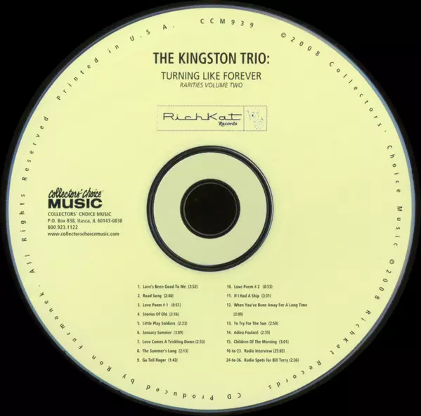 Kingston Trio: Turning Like Forever Rarities Volume Two La version sur CD en Norme édition. Cette édition particulière a été publiée en ÉTATS-UNIS dans la maison d'édition Collectors' Choice Music En collaboration avec RichKat Records Le 3 juin 2022. Album couvre tous les genres Rock, Pop et Pop Rock.