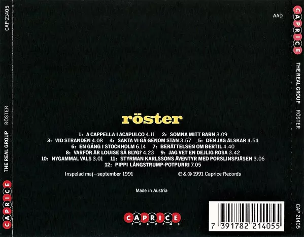The Real Group: Röster La version sur CD en Norme édition. Cette édition particulière a été publiée en Suède dans la maison d'édition Caprice Records Le 27 septembre 1994. Album couvre tous les genres Pop, Jazz et Vocal.
