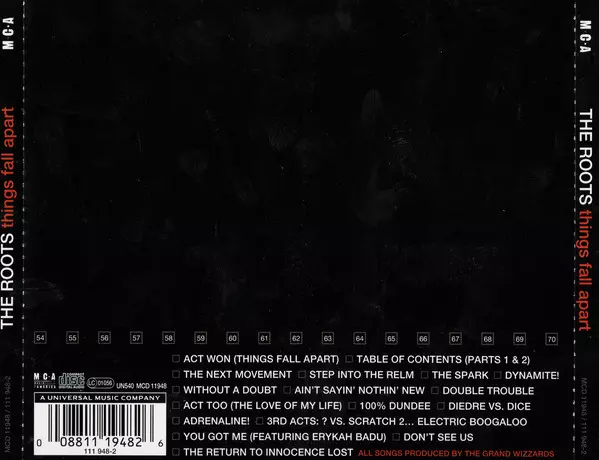 The Roots: Things Fall Apart La version sur CD en Norme édition. Cette édition particulière a été publiée en L'Europe dans la maison d'édition MCA Records Le 1 juin 2000.