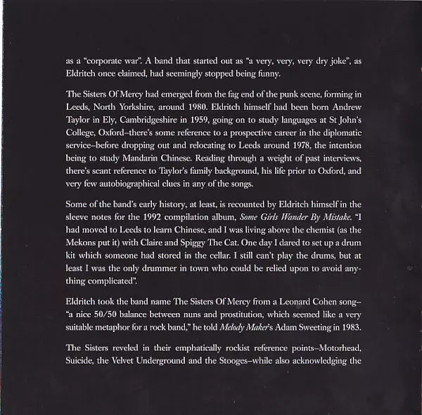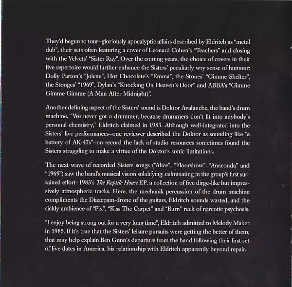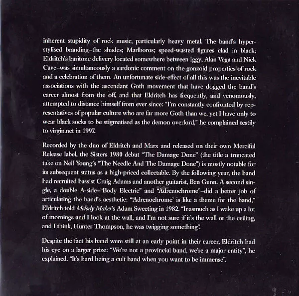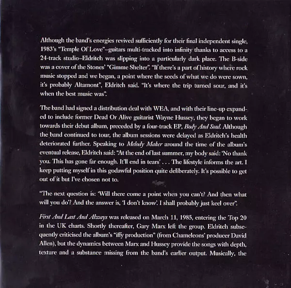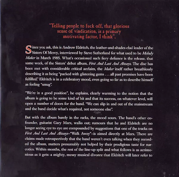 Sisters of Mercy's debut album "First and Last and Always" was released in 1985 and is considered a classic of the gothic rock genre. The album's dark and brooding sound was a departure from the pop-oriented music of the time and helped define the gothic rock genre. The singles from the album, "First and Last and Always" and "Temple of Love", we...