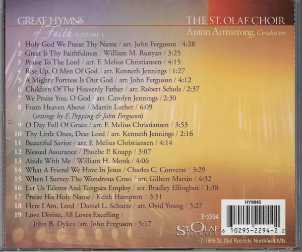 The St. Olaf Choir: Great Hymns Of Faith - Volume 1 La version sur CD en Norme édition. Cette édition particulière a été publiée en ÉTATS-UNIS dans la maison d'édition St. Olaf Records année 1999. Album couvre tous les genres Musique classique, Folk, World, & Country, Gospel et Religious.