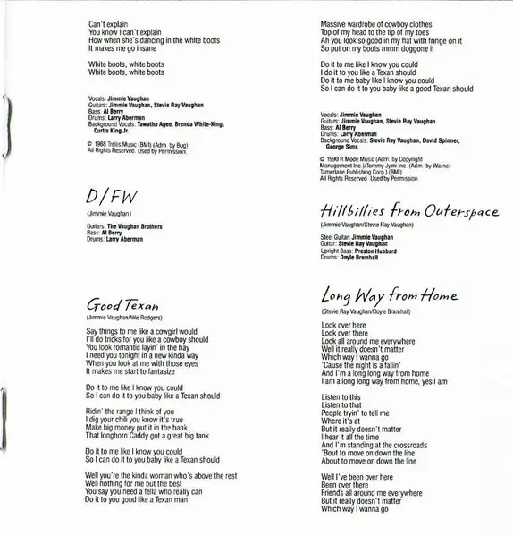 Backing Vocals Brenda White King, Curtis King, Tawatha | Bass Al Berry | Drums Larry Aberman | Guitar Stevie Ray Vaughan | Vocals, Guitar Jimmie Vaughan | Written-By Billy Swan, J. Leslie McFarland