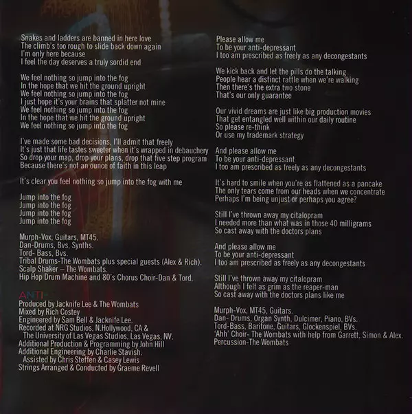 Backing Vocals [Melt Your Heart Bvs] The Wombats | Bass Tord Overland-Knudsen | Electric Guitar, Guitar [Additional Guitar] Dave Navarro | Engineer [Assisted By] Chris Steffen | Engineer [Engineered By] Charlie Stavish | Mixed By Rich Costey | Producer [Additional Production] John Hill (14) | Producer [Produced] Rich Costey | Programmed By [Programming] Dan Haggis, John Hill (14), Rich Costey, The Wombats, Tord Overland-Knudsen | Synthesizer [Synths] Dan Haggis, Matthew Murphy, Tord Overland-Knudsen