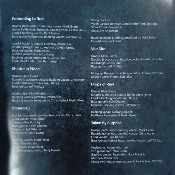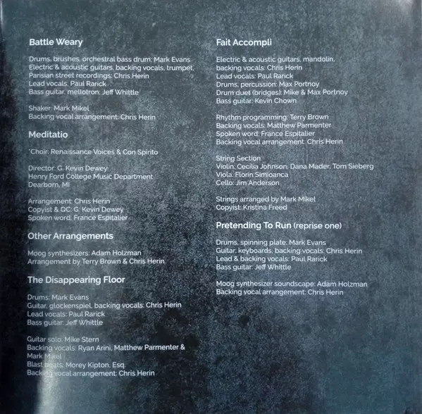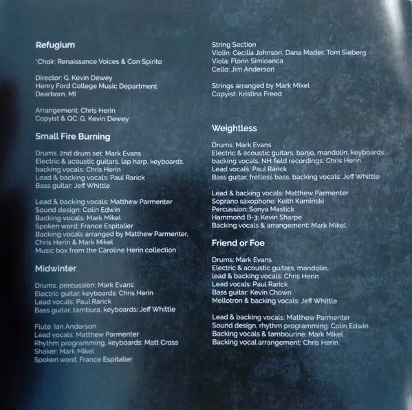 Backing Vocals Mark Mikel | Backing Vocals [Arranged by] Chris Herin, Mark Mikel, Matthew Parmenter | Lead Vocals, Backing Vocals Matthew Parmenter | Other [Spoken word] France Espitalier | Sound Designer [Sound design] Colin Edwin