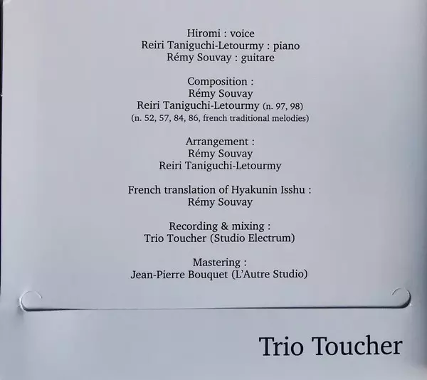 Trio Toucher: Hyakunin Isshu - 100 Tanka Songs La version sur 2CD en Norme édition. Cette édition particulière a été publiée en Suisse dans la maison d'édition Gallo (4) En collaboration avec Hototogisu Le 11 décembre 2020. Album couvre tous les genres Folk, World, & Country et Jazz.