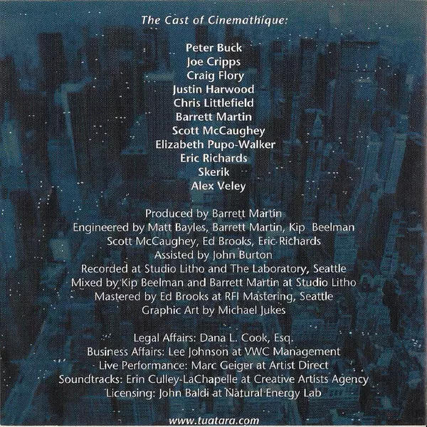 Clarinet Craig Flory | Congas Elizabeth Pupo-Walker | Drums, Vibraphone, Double Bass, Resonator Guitar [Dobro] Barrett Martin | Marimba Peter Buck | Percussion Joe Cripps | Piano Scott McCaughey