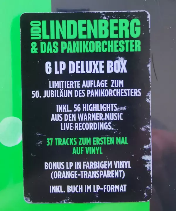 Udo Lindenberg Und Das Panikorchester: Live DLX | LTD | CLR La version sur Le vinyle 6LP/Coffret en deluxe Limité Coloré édition. Cette édition particulière a été publiée en Allemagne dans la maison d'édition Warner Music Group Central Europe Le 15 septembre 2023. Album couvre tous les genres Rock, Pop et Pop Rock. Limited Deluxe Box Coloured Orange Translucent (bonus LP) Vinyl Edition.