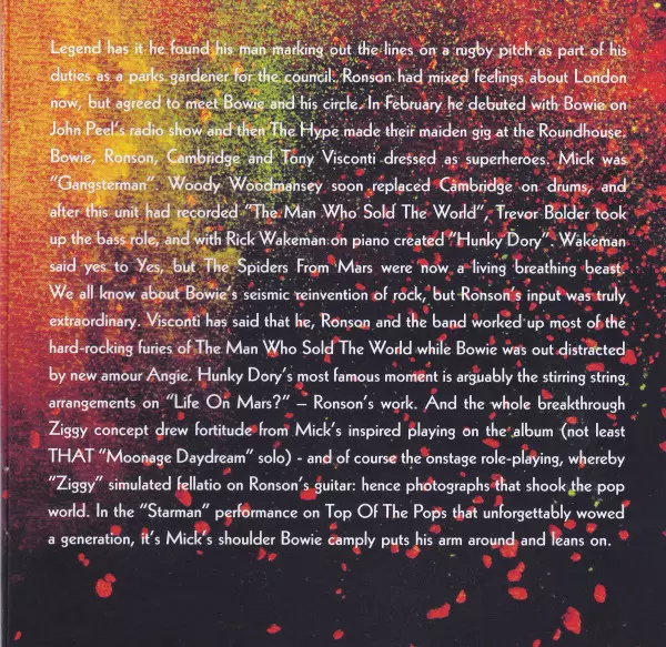 As a producer and guitarist, Mick Ronson has worked with artists such as Lou Reed, Morrissey, Ian Hunter and Mott The Hoople, Bob Dylan, John Mellencamp and many others, but this film is all about his indispensable contribution to David Bowie's colourful career and that entire musical era. The soundtrack is being released alongside the DVD and B...