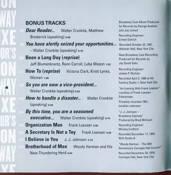 | 1 | How To Succeed In Business Without Really Trying (Original Broadway Cast Recording) Orchestra: Overture | 2:28 min | |