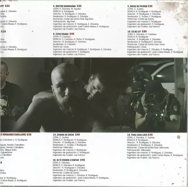 | Directed By Eduardo Dávalos, Román Rodríguez (3) | Featuring [Participación] Big Man (19) | Lyrics By Eduardo Dávalos, Ángel Miguel Aguilar | Mastered By Jay Franco | Mixed By Eduardo Dávalos, Román Rodríguez (3) | Music By Román Rodríguez (3) | Performer Big Man (19), Cartel De Santa | Realization Eduardo Dávalos, Román Rodríguez (3) | Recorded By José Carlos Reyes, Román Rodríguez (3) | |||