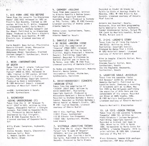 | Bass Guitar, Electronics Carlo Ronchi | Composed By Abderezac Ahmed, Alessandro Ronchi, Carlo Ronchi, Roberto Girardi, Stefano Sangalli | Drums, Percussion Roberto Girardi | Guitar Alessandro Ronchi | Mixed By Luca Gaudino | Producer Die Form (2), Electric Eye (3) | Saxophone, Clarinet Abderezac Ahmed | Synthesizer, Vocals Stefano Sangalli | Vocals F. White (2) | Written-By F. White (2) | |||