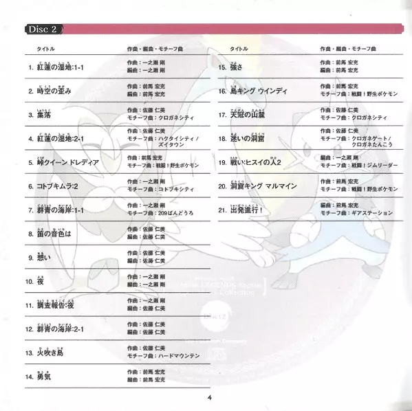Various: Nintendo Switch Pokémon Legends Arceus Super Music Collection = Nintendo Switch Pokémon Legends アルセウス スーパーミュージック・コレクション La version sur 4CD en Norme édition. Cette édition particulière a été publiée en Japon dans la maison d'édition Overlap (2) Le 8 mars 2024. Album couvre tous les genres Scène et écran et Video Game Music.