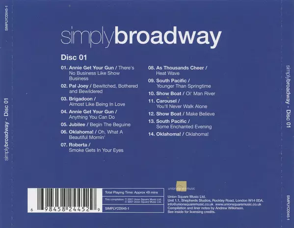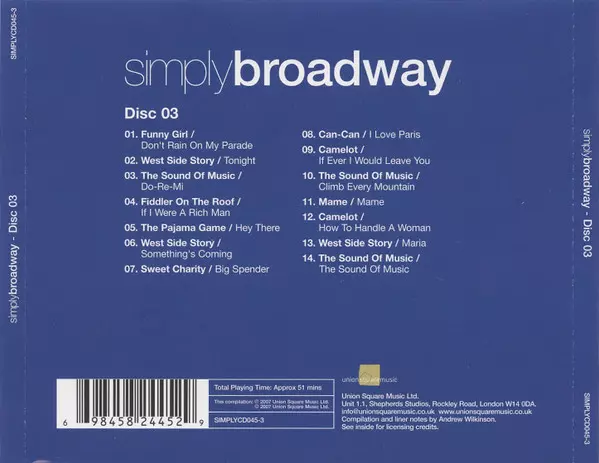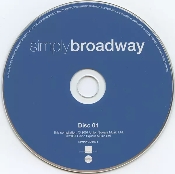 Various: Simply Broadway La version sur 4CD/Coffret en Norme édition. Cette édition particulière a été publiée en ROYAUME-UNI dans la maison d'édition Union Square Music En collaboration avec Simply Le 14 septembre 2007. Album couvre tous les genres Scène et écran et Musical.