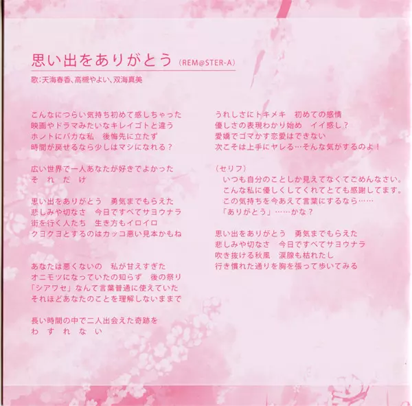 | 9 | Asami Shimoda, Mayako Nigo, Eriko Nakamura: 思い出をありがとう (Rem@Ster-A) | 4:19 min | |
