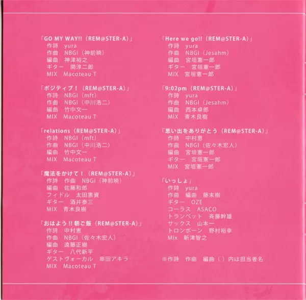 | 2 | Asami Shimoda, Akiko Hasegawa, Chiaki Takahashi: Go My Way!! (Rem@Ster-A) | 4:17 min | |