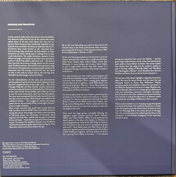 Various: The Original American Folk Blues Festival (Live In Paris 1962 • Bremen 1963) NUM | LTD La version sur Le vinyle 2LP en Numéroté individuellement Remasterisé Limité édition. Cette édition particulière a été publiée en France dans la maison d'édition The Lost Recordings Le 31 janvier 2025. Album couvre tous les genres Blues, Chicago Blues et Delta-Blues.