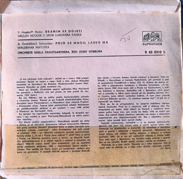 Chorus Lubomír Pánek Singers | Chorus Master Lubomír Pánek | Lyrics By [Uncredited] Ivo Fischer | Music By Bohuslav Ondráček | Vocals Waldemar Matuška | Written By [Erroneous] J. Schneider | |||