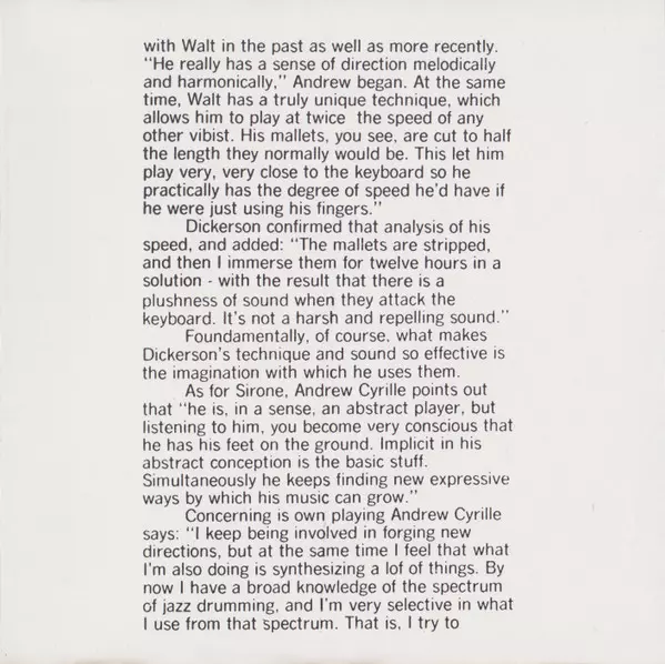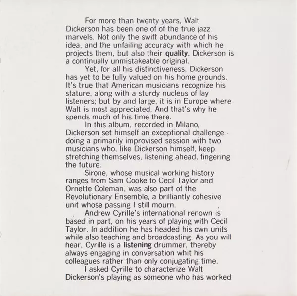 | Artiste | Andrew Cyrille | Walt Dickerson | Sirone |