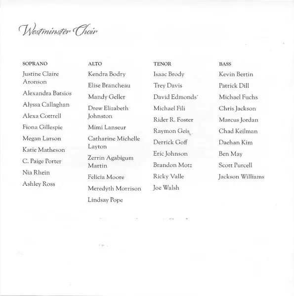 | Artiste | Jennifer Larmore | Westminster Choir | Ken Cowan | Joe Miller |