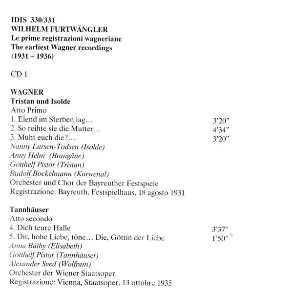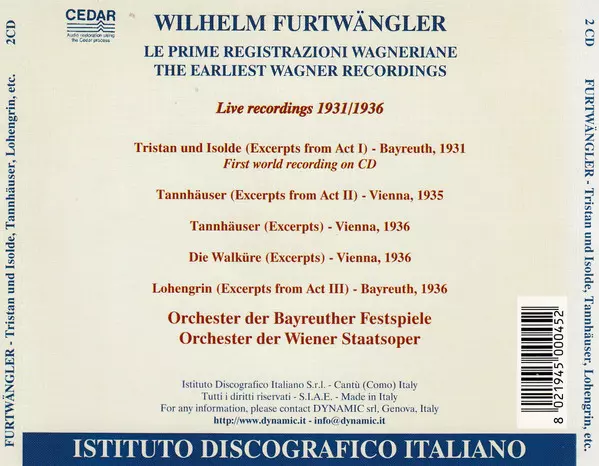 Titre | Le Prime Registrazioni Wagneriane = The Earliest Wagner Recordings / Live Recordings 1931-1936 - Tristan Und Isolde, Tannhäuser, Die Walküre, Lohengrin |