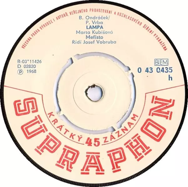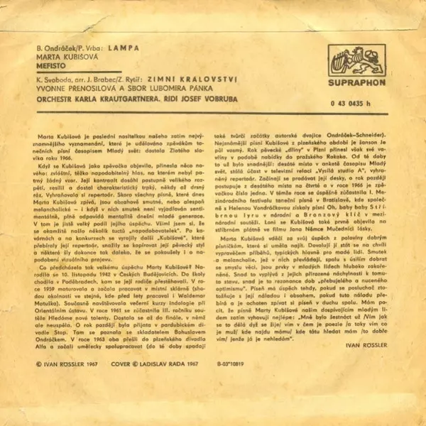 | Backing Band Mefisto (4) | Lyrics By Pavel Vrba | Music By Bohuslav Ondráček | Vocals Marta Kubišová | |||