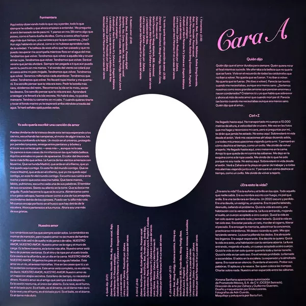 | Beats, Percussion [Percusión], Mellotron, Strings [Solina String Ensemble], Bass [Bajo], Lead Vocals [Voz], Vocoder, Vocals [Proceso Vocal] Zahara | Lyrics By [Letra De], Music By [Música Por] Zahara | Mixed By [Mezclado Por] Martí Perarnau | Piano, Strings [Solina String Ensemble], Synthesizer [Prophet-5], Other [Proceso Analógico] Martí Perarnau | Producer [Producido Por] Zahara | Recorded By [Grabado Por] Martí Perarnau, Zahara | |||